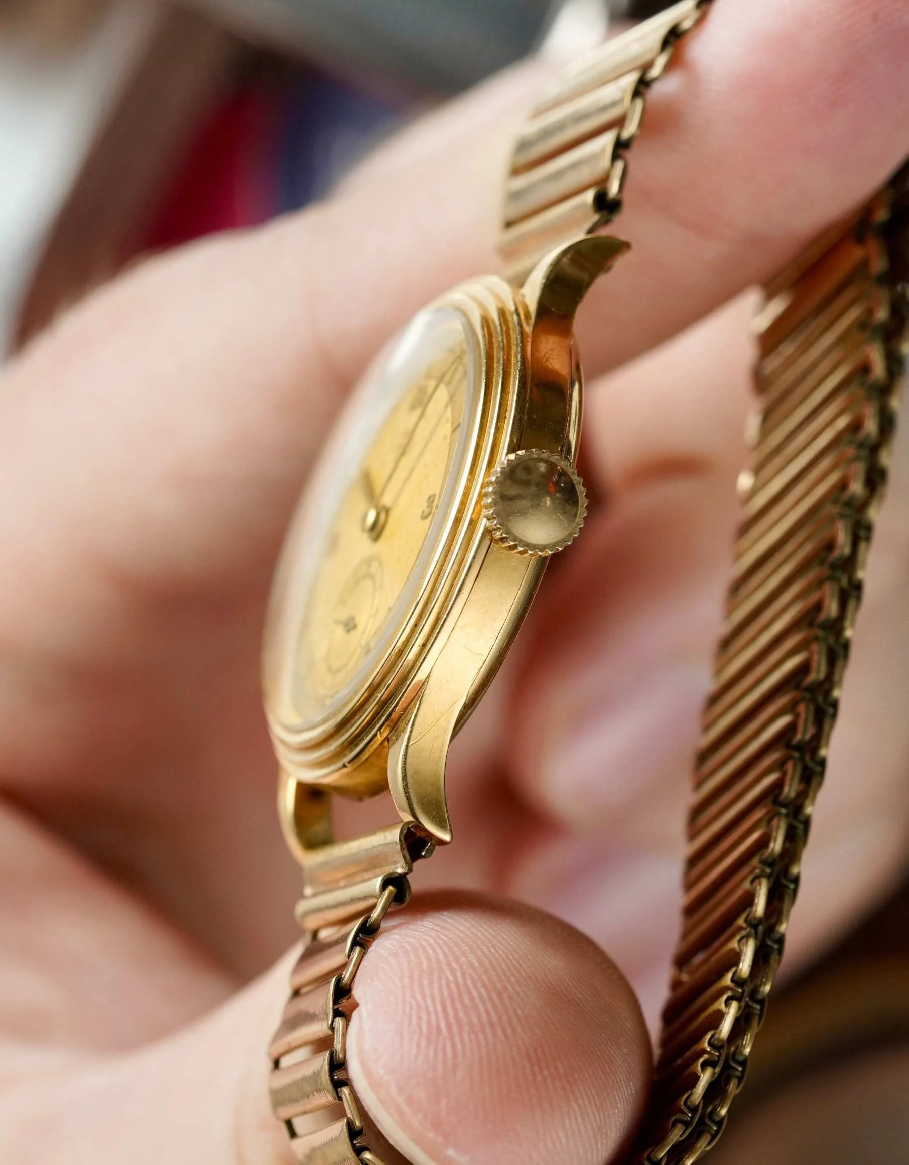 A rare stunner of an art deco inspired 1930’s Ebel in an 18K yellow gold triple stepped 33mm case with applied Breguet numerals, manual wind caliber, large crown on a 14K plated bonklip bracelet.